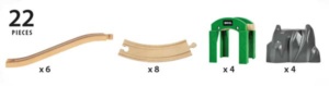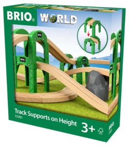 There’s never really been a practical way to get more than two of these Stacking Track Supports at a time from BRIO. This expansion pack gives you four of them plus four of the boulder supports, but it’s an odd way to do it. It also includes six ramps and eight large curves, which don’t really build anything useful on their own. Based on the box photo, which shows configurations that you can’t actually run a train over because there’s not enough clearance, BRIO isn’t sure what to do with it, either. You’re probably better off just buying two packs of the #33253 Stacking Track Supports for less than half the price (total).