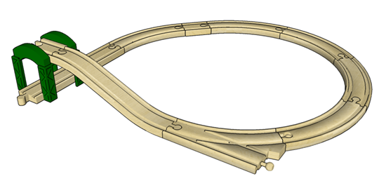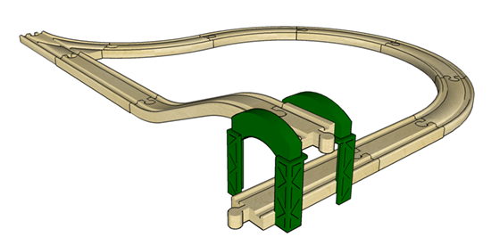 I pulled together some of my oldest pieces for this layout, which incorporates accessories from the 1960’s through the mid 1980’s. The Town set is the original version from around 1960, with double-sided printing on the buildings and a factory smokestack in red. The red lighthouses come from the second version of the Harbor Set which appeared in the mid 1970’s. Also present are two generations of the cars and trucks, the older set of which has wooden wheels (you can see the paint wear along their treads). The garage is harder to place as it was in production for well over a decade from the late 70’s through the 80’s. Similarly, the drawbridge could be from anytime between the early 60’s and the mid 70’s.